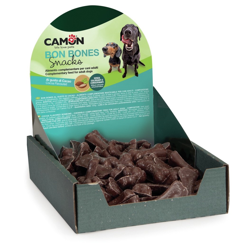 Camon čokolada u svom sastavu sadrži whey protein. Ne sadrži bojila i konzervanse. Namjenjea je odraslim psima.