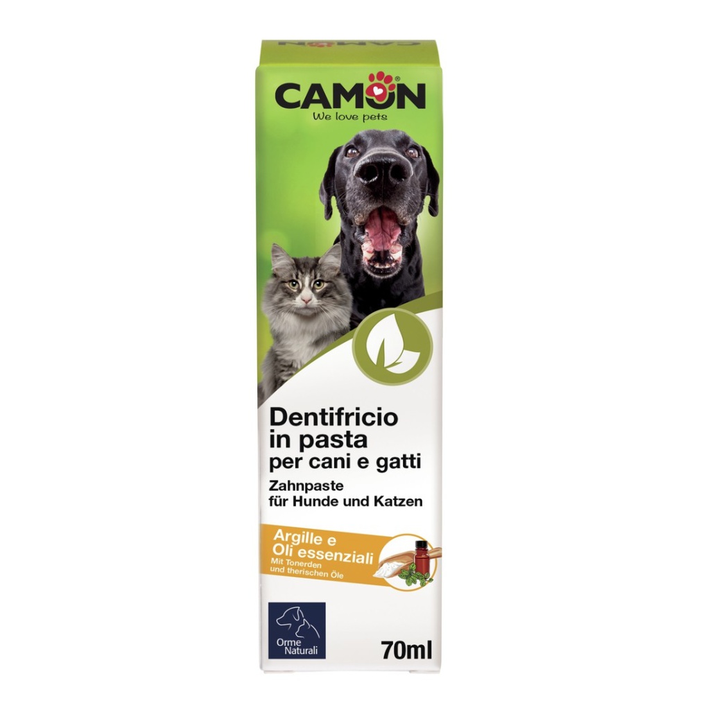 Camon Orme Naturali pasta za zube za pse i mačke zahvaljujući sadržaju gline i eteričnih ulja dubinski čisti zube nježnim abrazivnim djelovanjem.