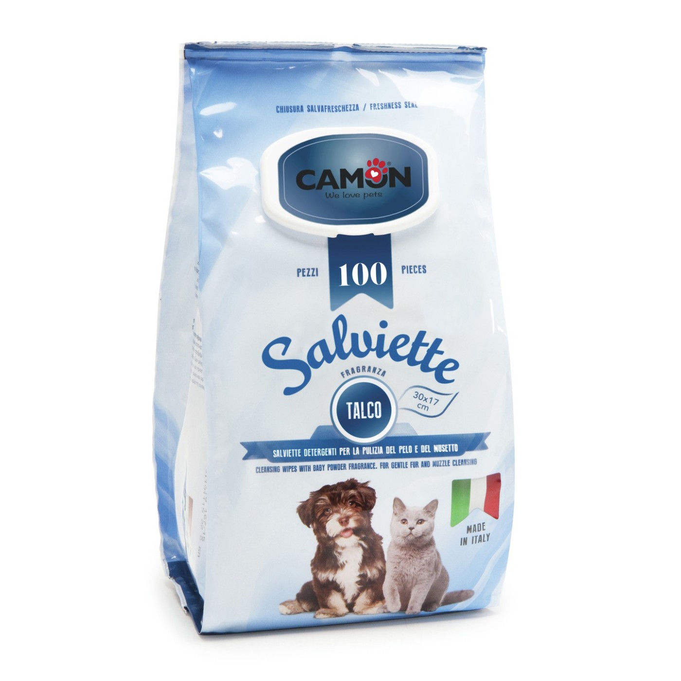 Camon Vlažne maramice sa talkom idealan je za svakodnevnu njegu vašeg ljubimca. Zahvaljujući praktičnom maxi formatu, maramice su uvijek pri ruci – bilo kod kuće ili na putovanju. Pomažu u čišćenju dlake i šapa, uklanjanju neugodnih mirisa te nježnom čišćenju njuške i ušiju.