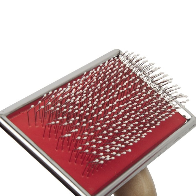 Četka s drvenom drškom i iglama od nehrđajućeg čelika obloženih plastikom.