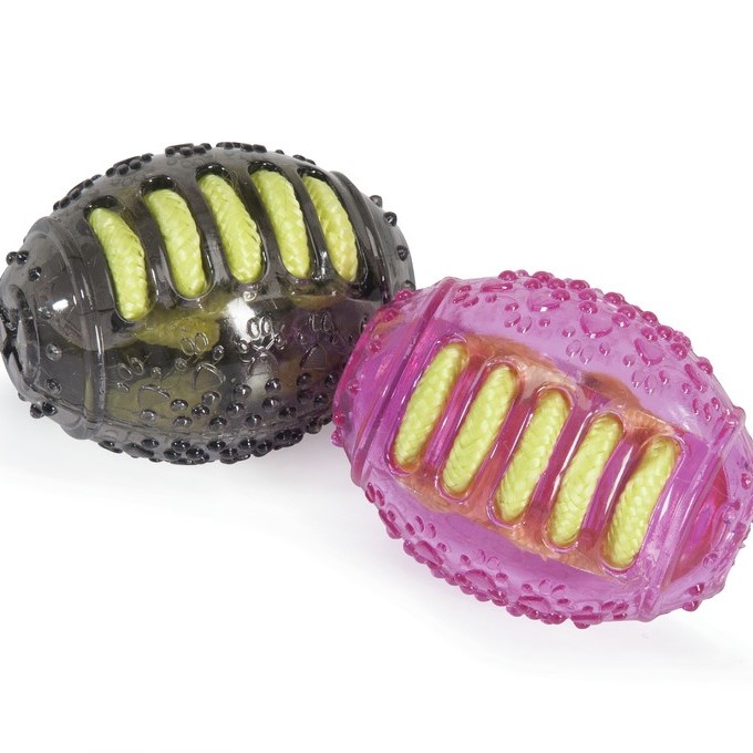 Igračka u obliku ragbi lopte savršena za poticanje zdravog kretanja i žvakanja vašeg psa. Sadrži otvor za poslastice za dodatnu stimulaciju.